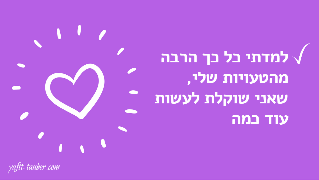 האם הייתם שופטים תינוק שרק למד ללכת, נתקל במכשול ונפל? הרי עצם ההיתקלות במכשול וה"טעות" שהובילה לנפילה היא זו שמאפשרת לו ללמוד ללכת טוב יותר. - הטעות אינה מייצגת את מי שאנחנו כמכלול ואינה מעידה על האדם שאנחנו, אלא מתארת פעולה אחת שנעשתה מתוך אלפי החלטות ופעולות שעשינו בחיים שלנו.